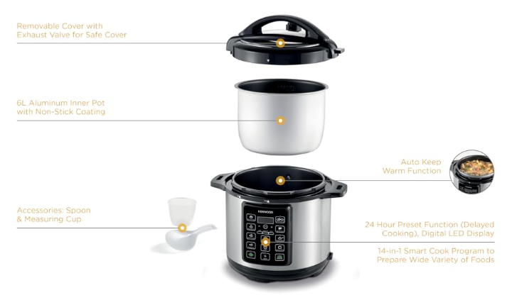 Electric Pressure Cooker KN-2024 Model Number: KN-2024 Color : Silver Capacity: 6L Power: 1000W Voltage: 220-240V 50/60Hz Material: Metal Special Features; Keep Warm function Temperature protection device Cool touch body Non-stick coating inner pot Energy efficient design Lid On-Off Safety Pressure release device Timer
