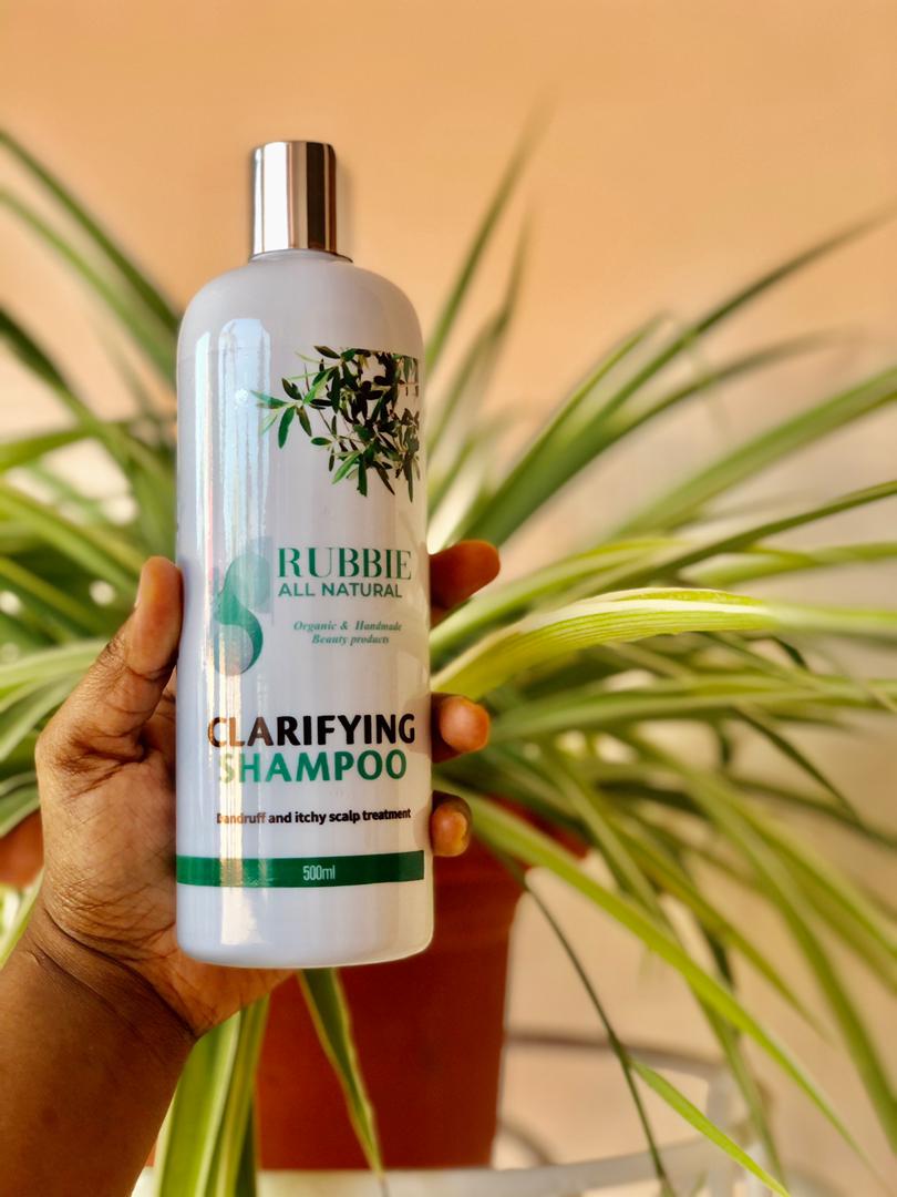 Name: CLARIFYING SHAMPOO. Well mixed with black soap, bentonite clay, mint oil, lemon oil, apple cider vinegar, peppermint essential oil, rosemary oil, Eucalyptus oil, neem leaves, moringa leaves, guava leaves. INSTRUCTIONS: Apply a moderate amount of this shampoo direct on your scalp. Massage in for few minutes then rinse it off. It should not be used more than twice a month. BENEFITS: Removes product buildups on the scalp and the hair, Removes and treats dandruff and itchy scalp, Boosts healthy hair growth, Rejuvenates and refreshes the hair, prevents bacterial grow on your scalp, restores natural PH balance of your hair. Soothes itchy scalp