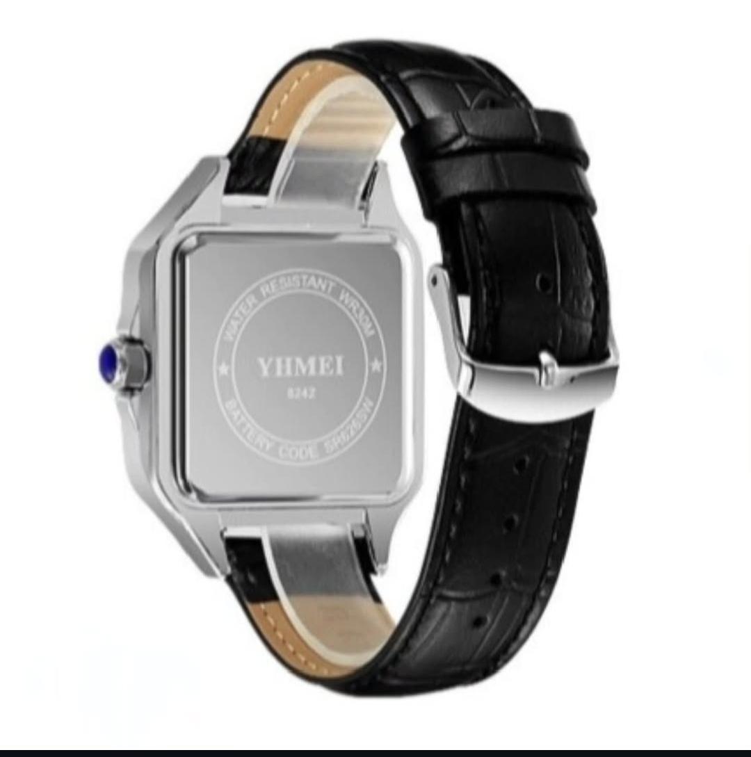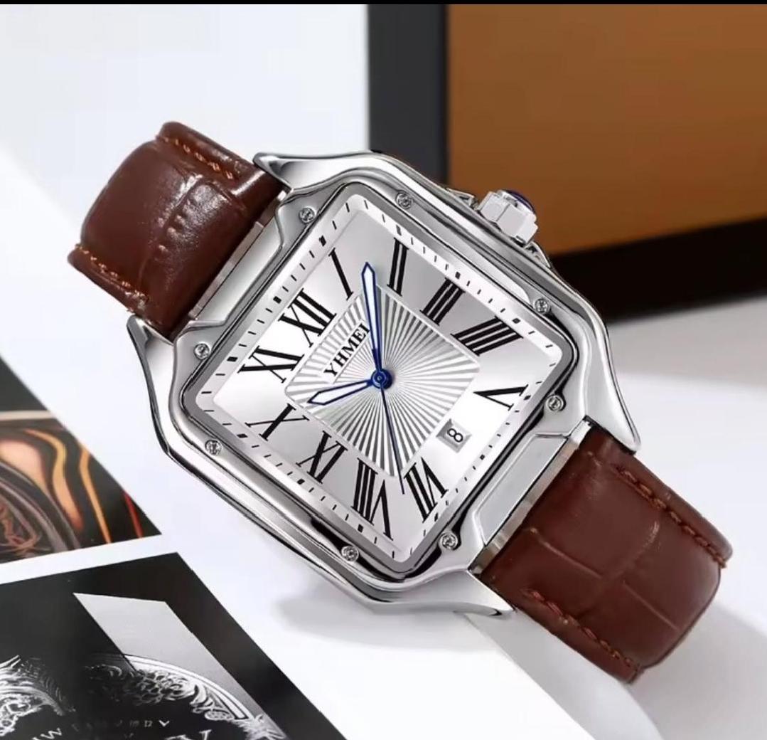 Command attention with the YHMEI Roman Numeral Luxury Watch, where vintage elegance meets modern masculinity. Designed for those with a taste for refined style, this timepiece balances bold form with classic elements, making it perfect for both formal wear and upscale everyday looks. Key Features: Unique Square Case: Polished silver-tone square stainless steel body with geometric contours and visible screws for a bold, industrial flair. Classic Roman Numeral Dial: Striking black dial adorned with full white Roman numeral hour markers. Subtle sunburst pattern in the center adds depth and texture to the design. Elegant Hands: Sword-style metallic blue hour and minute hands, giving a premium, luxury feel. Date Window: Discreet date display positioned above 6 o’clock for daily convenience. Sophisticated Strap: High-quality black leather strap with crocodile embossing, offering comfort and class in one. Crown Accent: Jewel-like blue cabochon crown gives a hint of royalty and distinctive style.