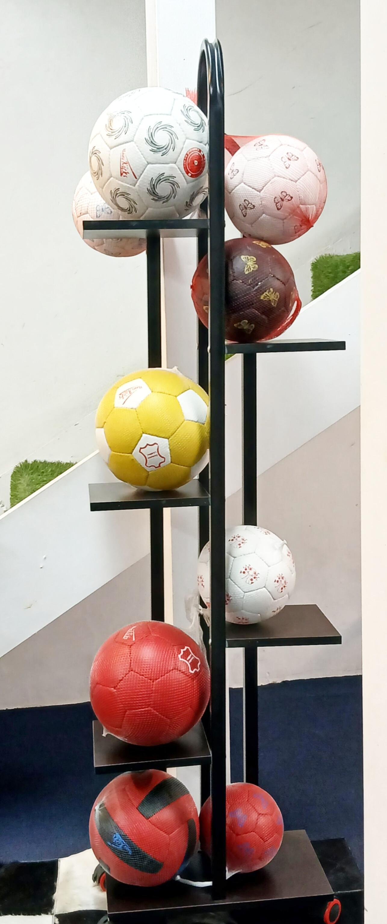 A vertical metal ball rack designed for displaying and storing balls. It has multiple shelves arranged from top to bottom, each holding a single ball. The rack is strong, modern, and space-saving, with small wheels at the base for easy movement. It is perfect for shops, gyms, or sports areas to neatly organize different types of balls.