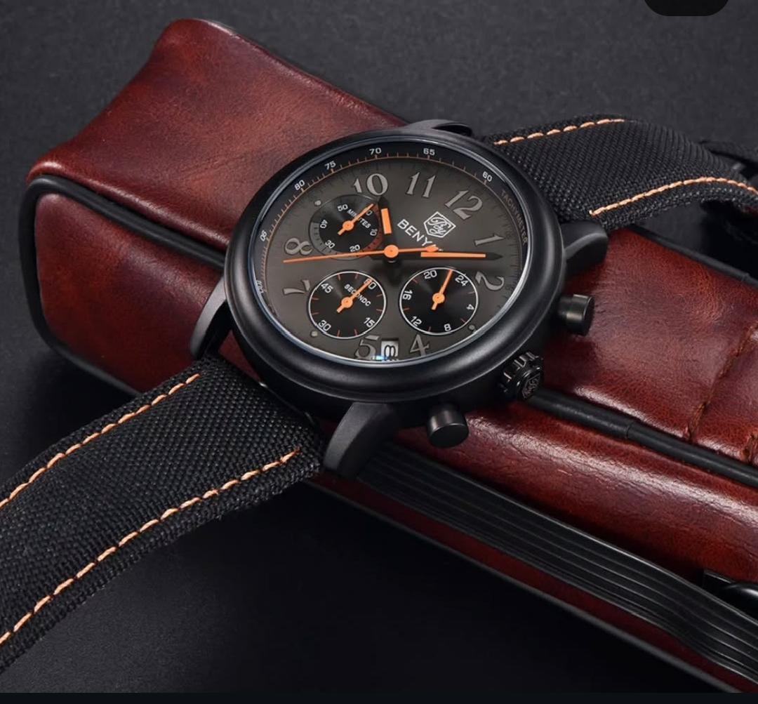 Add a bold touch to your look with the Benyar Men’s Chronograph, a watch that combines rugged design with reliable performance. Perfect for both casual and formal settings, this timepiece is built for men who value style and functionality. Key Features: Chronograph Functionality: Three sub-dials for minutes, seconds, and 24-hour display, giving you precision time tracking. Stylish Dial: Grey dial with Arabic numeral markers and orange accents, delivering a modern sporty vibe. Durable Strap: Black fabric strap with orange stitching, offering comfort and strength for everyday wear. Quartz Movement: Provides accurate and dependable timekeeping. Date Display: Small date window positioned at 6 o’clock for practicality. Tachymeter Scale: Printed on the outer rim for measuring speed and distance. Water Resistant: Suitable for daily use, resistant to splashes and rain (not for swimming/diving). Why You’ll Love It: The Benyar Chronograph is more than just a watch—it’s a statement of style and confidence. Its sporty yet elegant design makes it versatile enough for work, leisure, or special occasions.