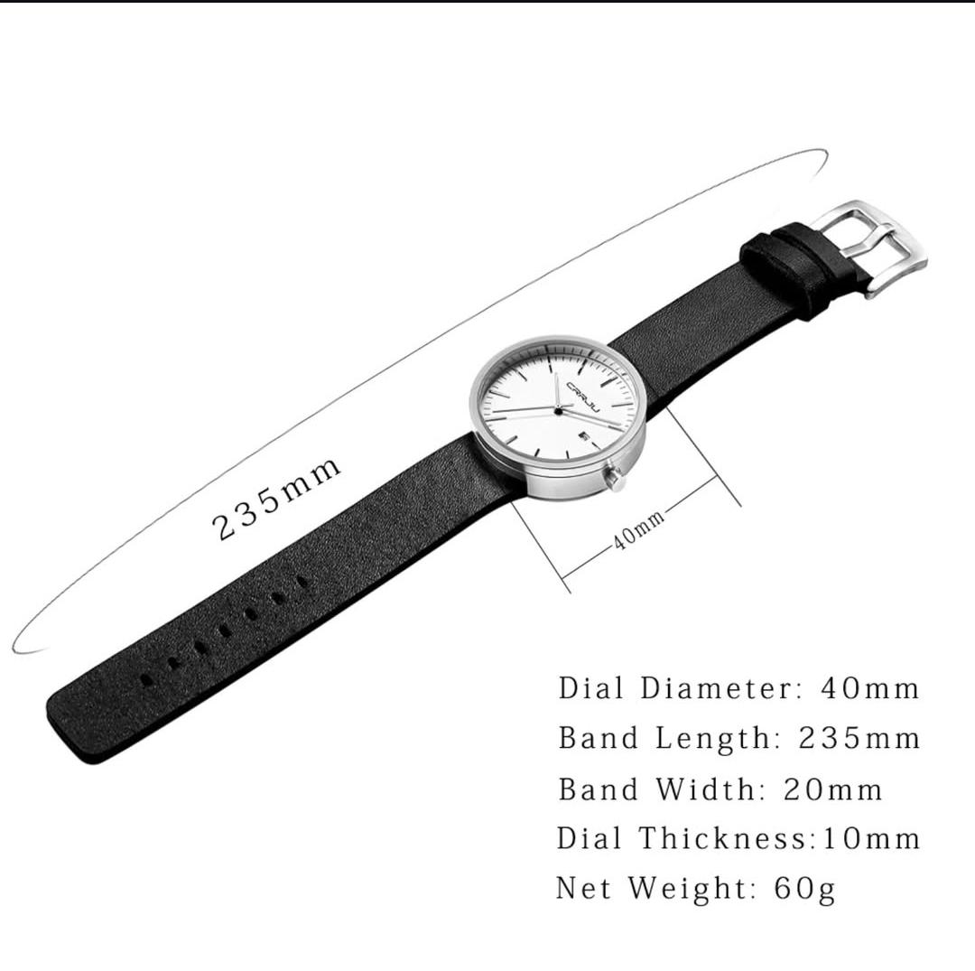Redefine elegance with the CRRJU Ultra-Slim Quartz Watch, crafted for those who appreciate minimalist design and functional style. This timepiece is the perfect blend of simplicity and modern sophistication, making it a go-to accessory for everyday wear or professional settings. ✨ Design & Features Dial: Sleek silver-tone face with ultra-thin hour markers and minimalist lines, designed to give a clean and clutter-free look. Display: Analog layout with a small date window at the 4 o’clock position, subtly integrated into the dial without breaking the minimalism. Movement: Accurate and low-maintenance quartz movement, ensuring precise timekeeping. Case: Slim, round stainless steel case with a brushed finish for a modern aesthetic. Strap: Smooth black leather band with adjustable buckle, offering a comfortable and secure fit. Crown: Small and refined, positioned neatly for easy adjustment. 🧩 Style Appeal This watch is ideal for: Minimalist fashion lovers Professionals seeking a refined everyday accessory Gifting for birthdays, anniversaries, or business occasions It pairs effortlessly with casual, office, and semi-formal outfits, adding a subtle statement of class without excess detail.