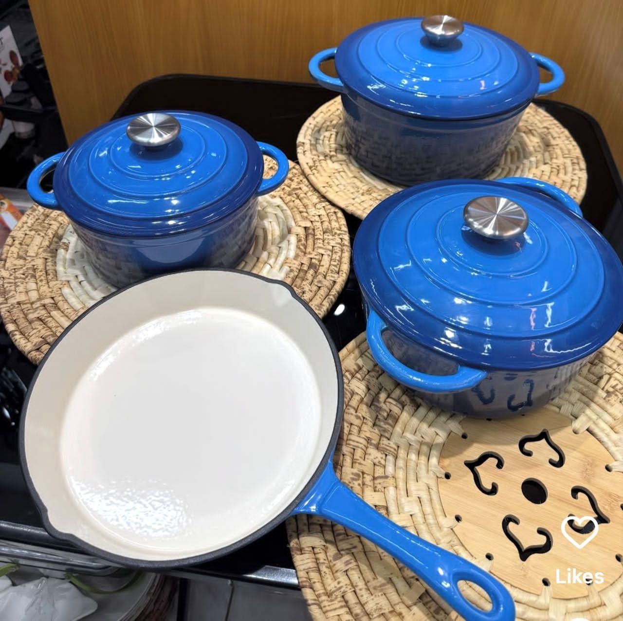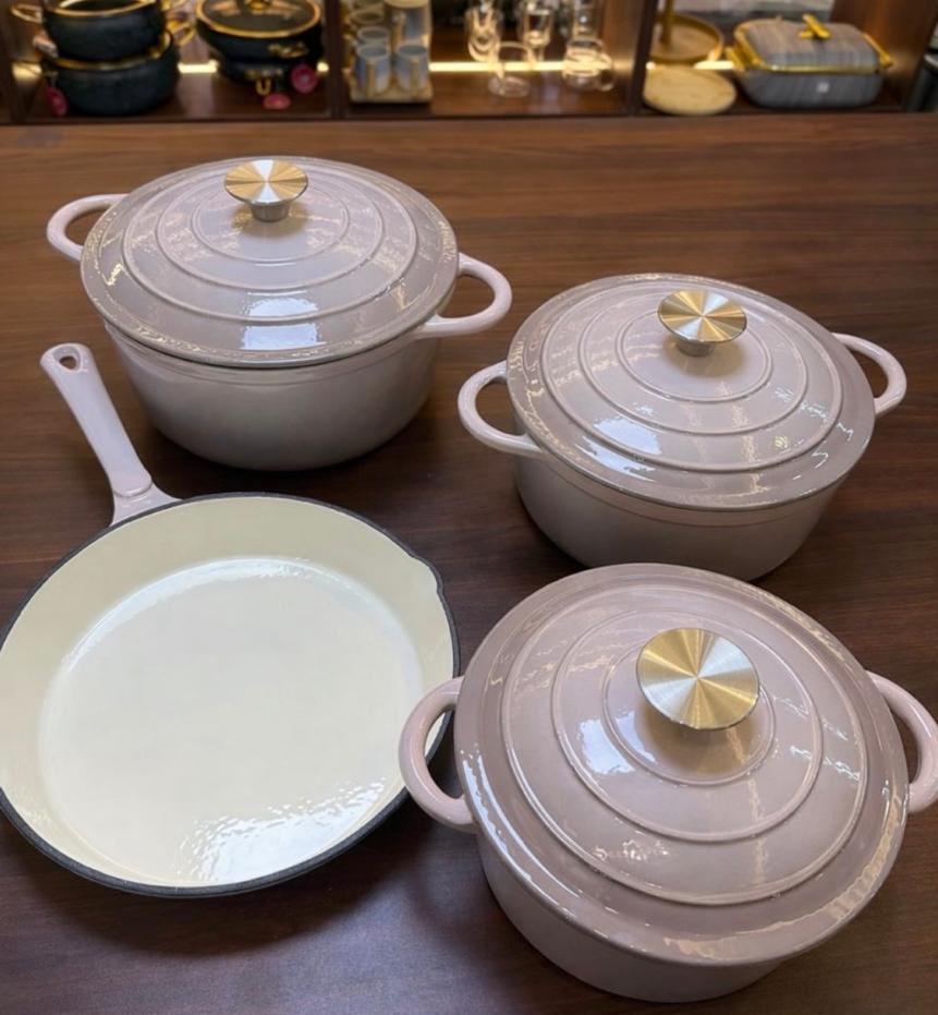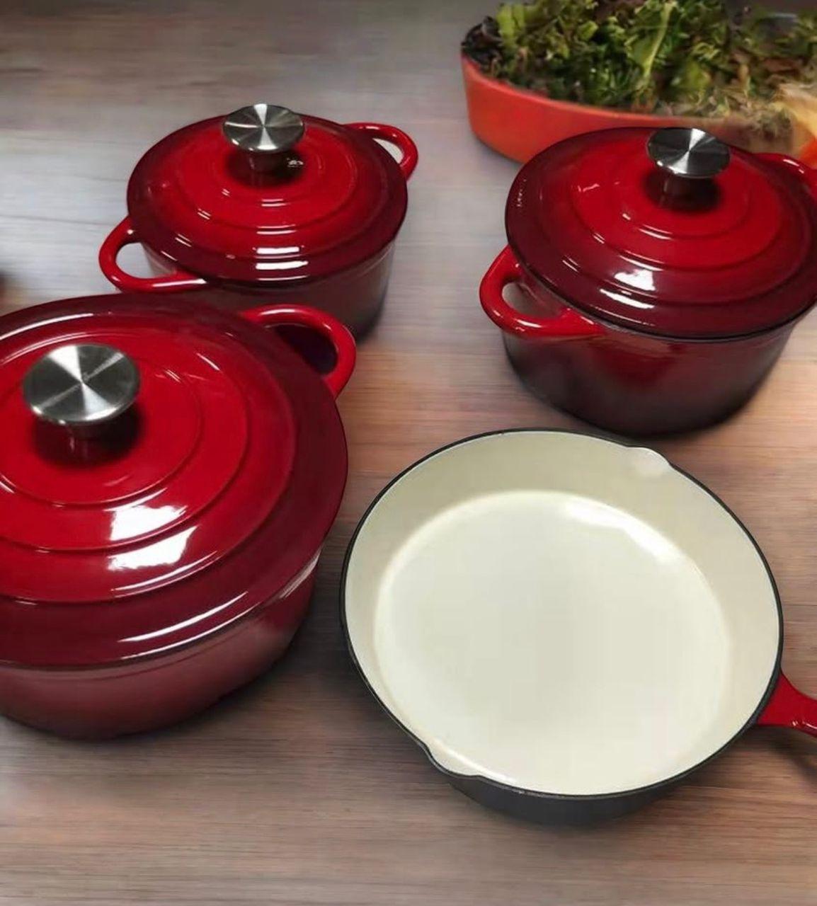 Material: Heavy-duty cast iron with a non-reactibe enamel coating. Set Components: Common pieces include Dutch ovens of varying sizes, a braiser, a lasagna/roasting pan, a skillet, and a grill pan. Compatibility: Suitable for all cooktops, including gas, electric, and induction, and they are oven-safe. Features: The enamel finish prevents rusting and eliminates the need for seasoning.