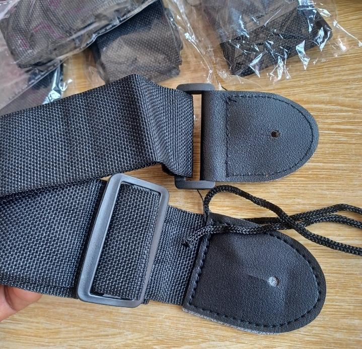 The first strap is black with red flames, giving it a bold rock-and-roll look. Two straps are pink with cartoon skull and cat designs, playful and fun for those who like a quirky style. Another two straps feature an American flag theme with stars, stripes, and a black cat silhouette, perfect for players who enjoy unique or patriotic designs. The last strap is a plain beige woven strap, simple and classic for those who prefer a neutral style. All the straps have leather or faux leather ends with holes and cords for attaching to the guitar. They are also adjustable in length, making them suitable for different players and instruments, whether electric, acoustic, or bass. Overall, this collection combines functionality with personal style, offering guitarists options to match their personality and music.