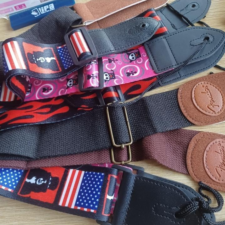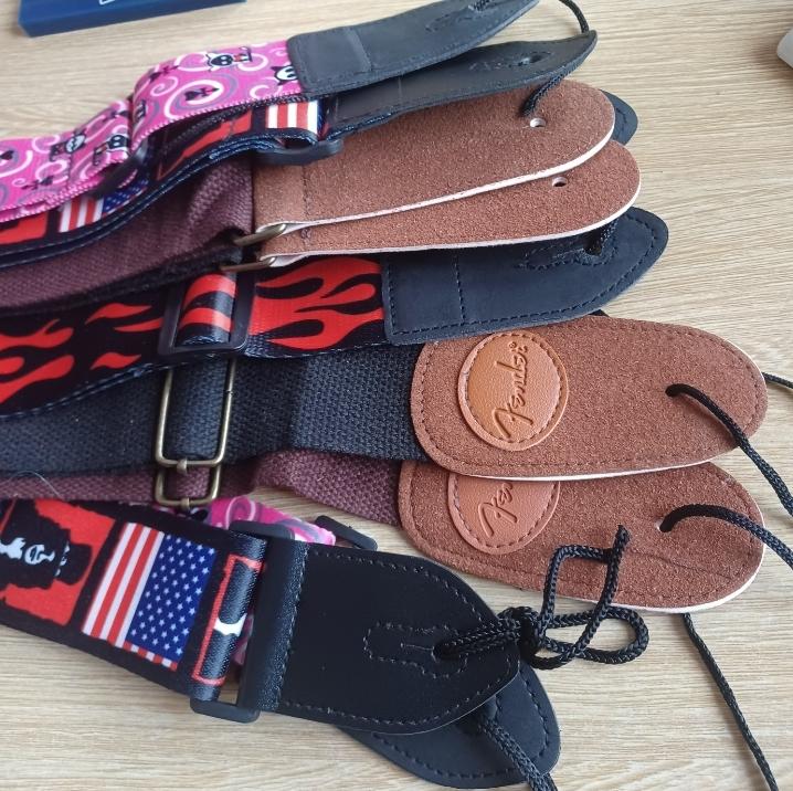 This image shows a collection of six different guitar straps spread out on a light wooden surface, likely a tabletop. The straps are positioned side by side, overlapping slightly, with their ends aligned at the bottom of the image where the attachment holes and leather/faux leather ends are visible. These straps are designed for electric guitars, acoustic guitars, or bass guitars, serving both a functional purpose (to support the instrument while playing) and an aesthetic one (to add style and personality to the player’s gear). Each strap features a distinct design: Far left strap – This strap has a bold red flame design on a black background, giving it a fiery, rock-and-roll aesthetic that matches well with electric guitars, especially for players in rock, punk, or metal genres. The ends are made of black leather/faux leather with a cut-out hole for securing the strap to the guitar’s strap buttons. Second strap – A vibrant strap with a pink background featuring repeating patterns of small skulls and cats. The skulls are stylized in a cartoonish way, giving it a playful yet edgy look. This strap also has black leather/faux leather ends and an adjustable buckle in the middle for customizing the length. Third strap – A more minimalist beige strap made of woven fabric material, without any printed designs. It looks sturdy and durable, offering a classic and simple option for players who prefer functionality over flashy designs. This strap has brown suede-like ends that add to its traditional aesthetic. Fourth strap – Similar to the second strap, it features a pink design with repeating cartoon skull and cat illustrations. It has the same lively vibe, making it suitable for players who enjoy colorful and quirky accessories. Fifth strap – A bold American flag–inspired strap, decorated with red and white stripes, blue fields with white stars, and a black silhouette of a sitting cat. This design is repeated along the length of the strap, giving it a patriotic yet unique theme. Sixth strap (far right) – Another strap with the same American flag and cat silhouette design as the fifth one. It also has black leather/faux leather ends with adjustment hardware, allowing for length customization. At the bottom of each strap, the attachment ends are visible. These are typically made of reinforced materials (leather, suede, or synthetic leather) to prevent tearing when holding the weight of a guitar. Some of the ends also feature nylon cords, which are used for securing the strap to the headstock of acoustic guitars that may not have a front strap button. The collection as a whole represents a mix of styles and personalities: The flame strap for bold, energetic players. The pink skull-and-cat straps for playful or punk-inspired looks. The American flag cat straps for patriotic or statement-making performers. The plain beige strap for those who prefer a neutral, classic appearance.