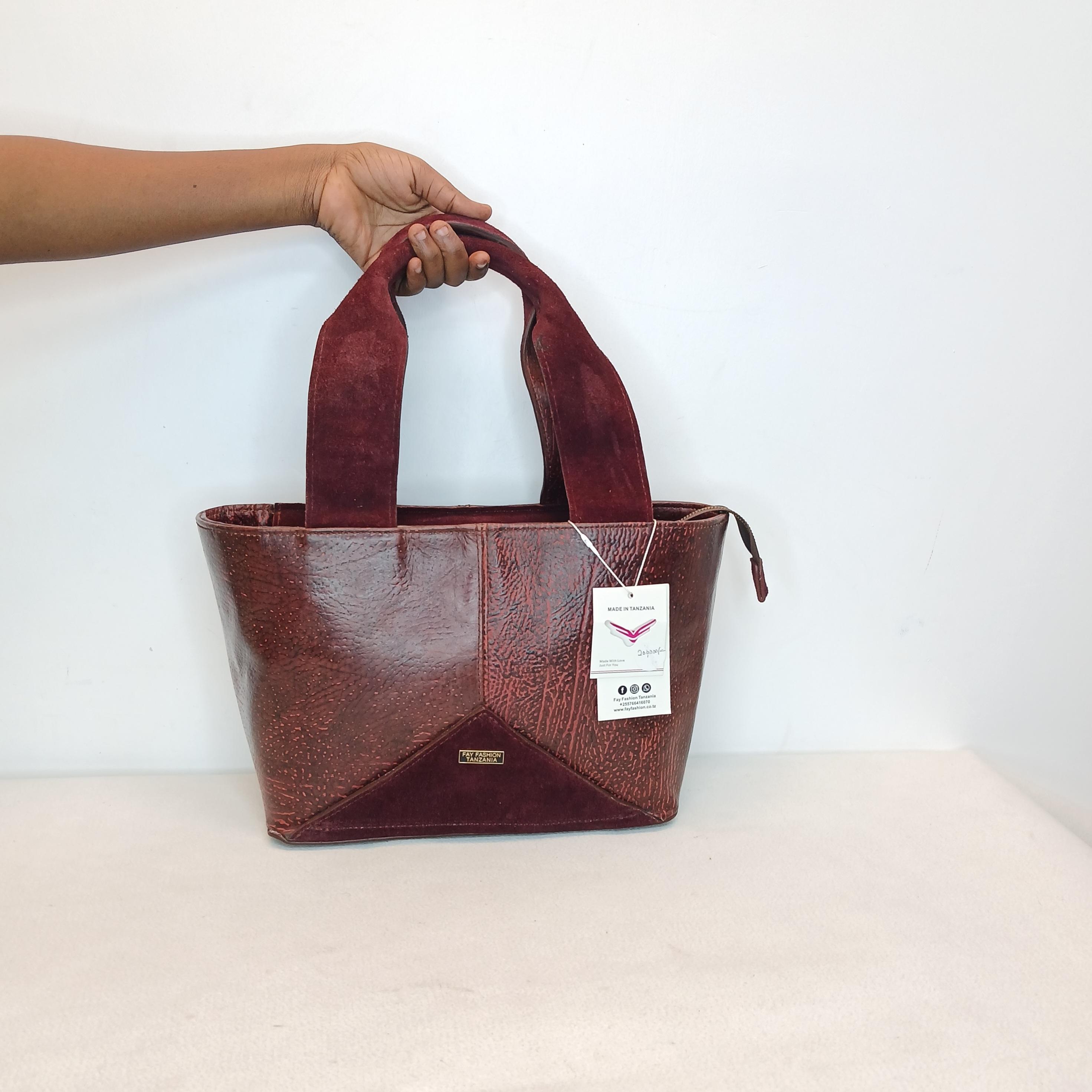 π Two-Tone Burgundy Leather & Suede Tote β Handmade in Tanzania Material: Combination of textured leather and soft suede Color: Deep burgundy / wine red Design: Triangular suede panel and suede handle contrast Style: Small to medium-sized tote bag β¨ Features: Premium Mixed Material Design: Eye-catching blend of glossy embossed leather and smooth suede creates a rich, artisanal look. Comfortable Suede Handles: Thick and soft handles that sit gently in hand β ideal for light daily carry. Secure Zip Closure: Top zipper keeps all your essentials safely enclosed. Structured Bottom Shape: Designed to hold its form and stand upright when placed down. Locally Made with Precision: Carefully stitched and crafted in Tanzania, celebrating local fashion and quality. π Approximate Dimensions: Width: 30β32 cm Height: 22β24 cm Depth: 12 cm