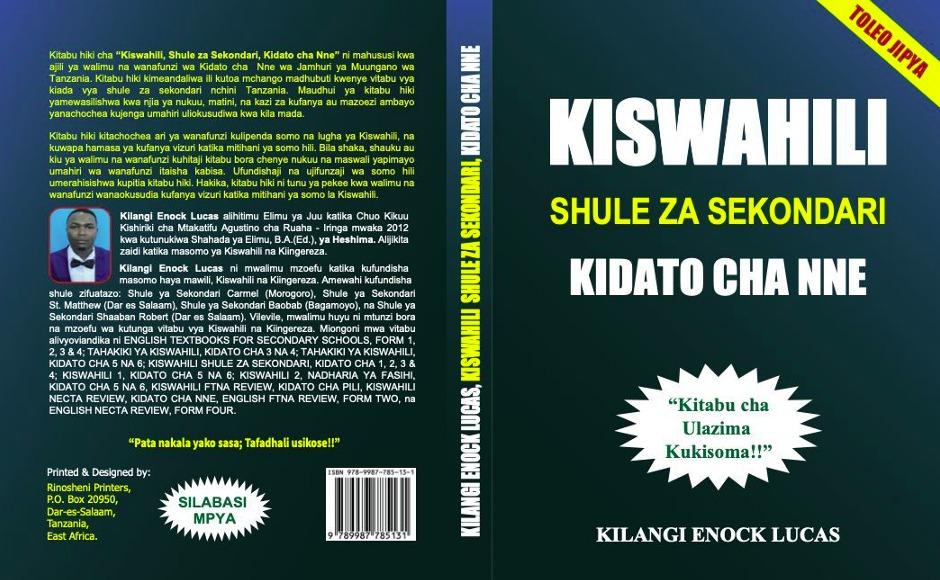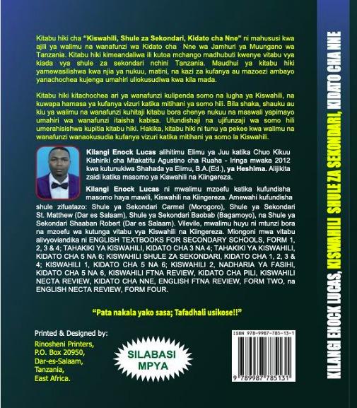 Kitabu hiki cha "Kiswahili, Shule za Sekondari, Kidato cha Nne" ni mahususi kwa ajili ya walimu na wanafunzi wa Kidato cha Nne wa Jamhuri ya Muungano wa Tanzania. Kitabu hiki kimeandaliwa ili kutoa mchango madhubuti kwenye vitabu vya kiada vya shule za sekondari nchini Tanzania. Maudhui ya kitabu hiki yamewasilishwa kwa njia ya nukuu, matini, na kazi za kufanya au mazoezi ambayo yanachochea kujenga umahiri uliokusudiwa kwa kila mada.