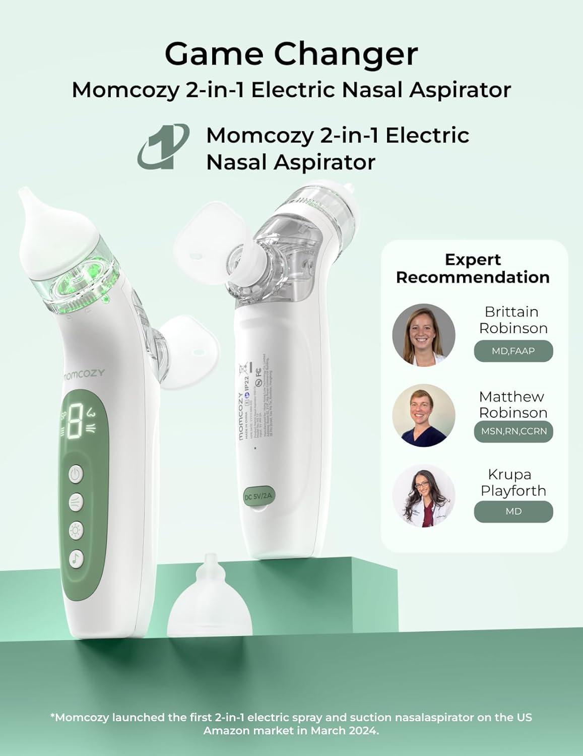 Momcozy BreezyClear™ 2-in-1 Electric Nasal Aspirator for Baby with Spray, 65kPa Hospital-Grade Suction, 4 Adjustable Levels, Quiet & Portable Nose Cleaner with Soothing Light & Music
